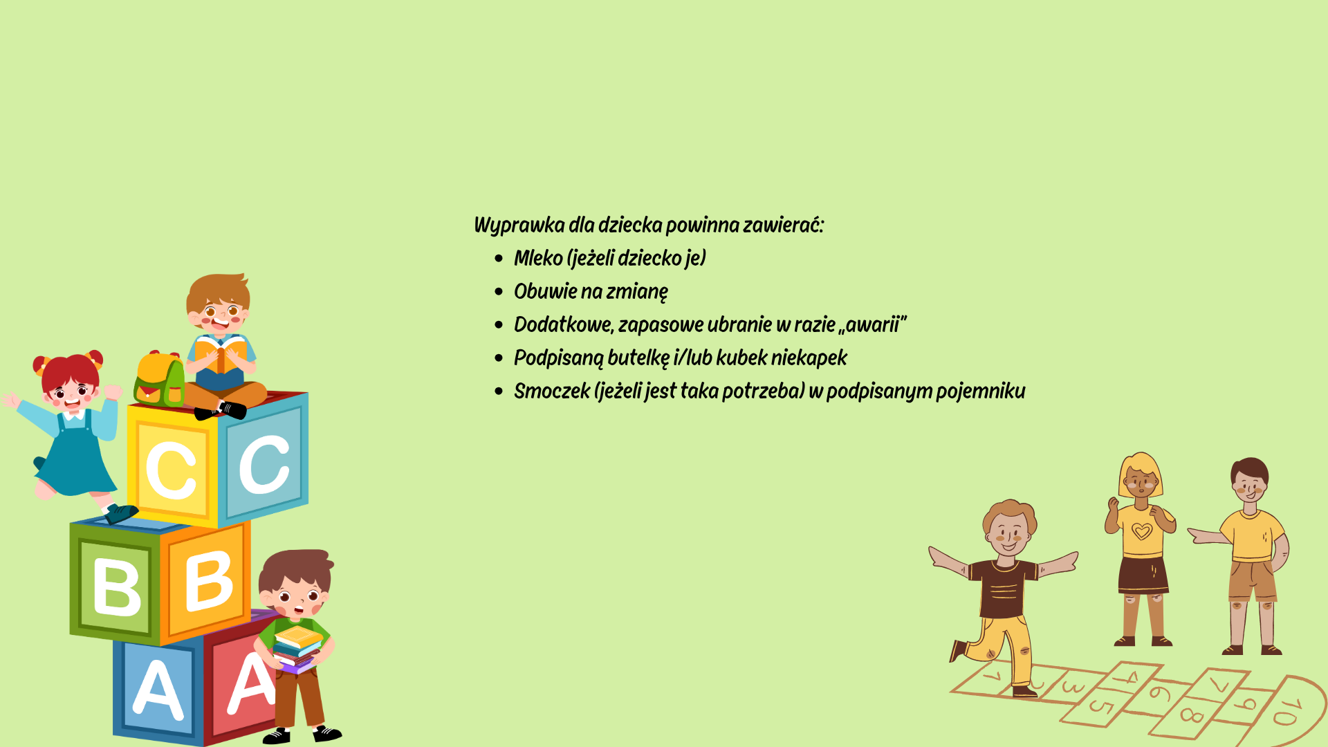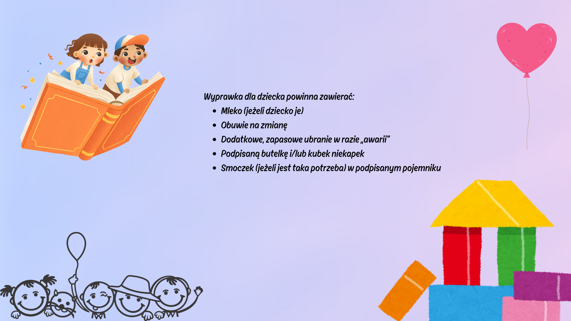 - Smoczek (jeżeli jest taka potrzeba) w podpisanym pojemniku