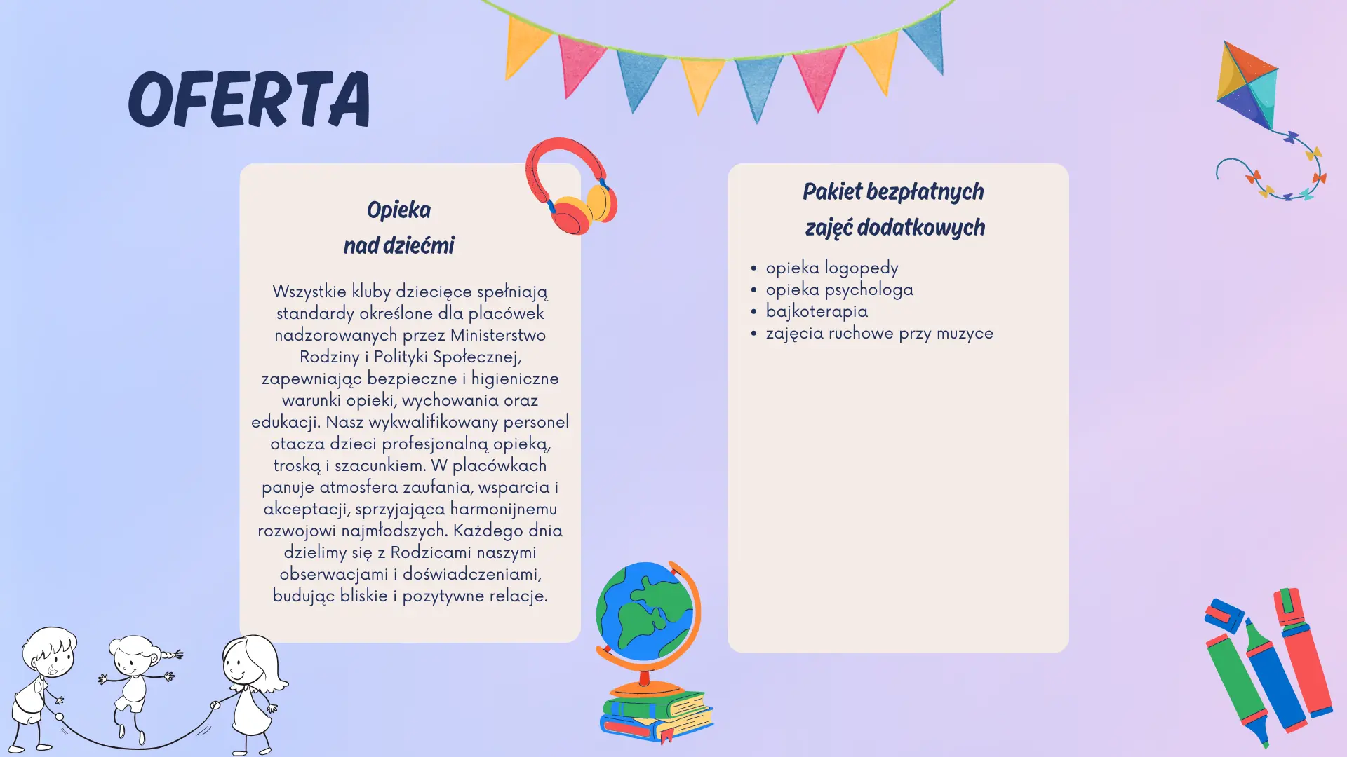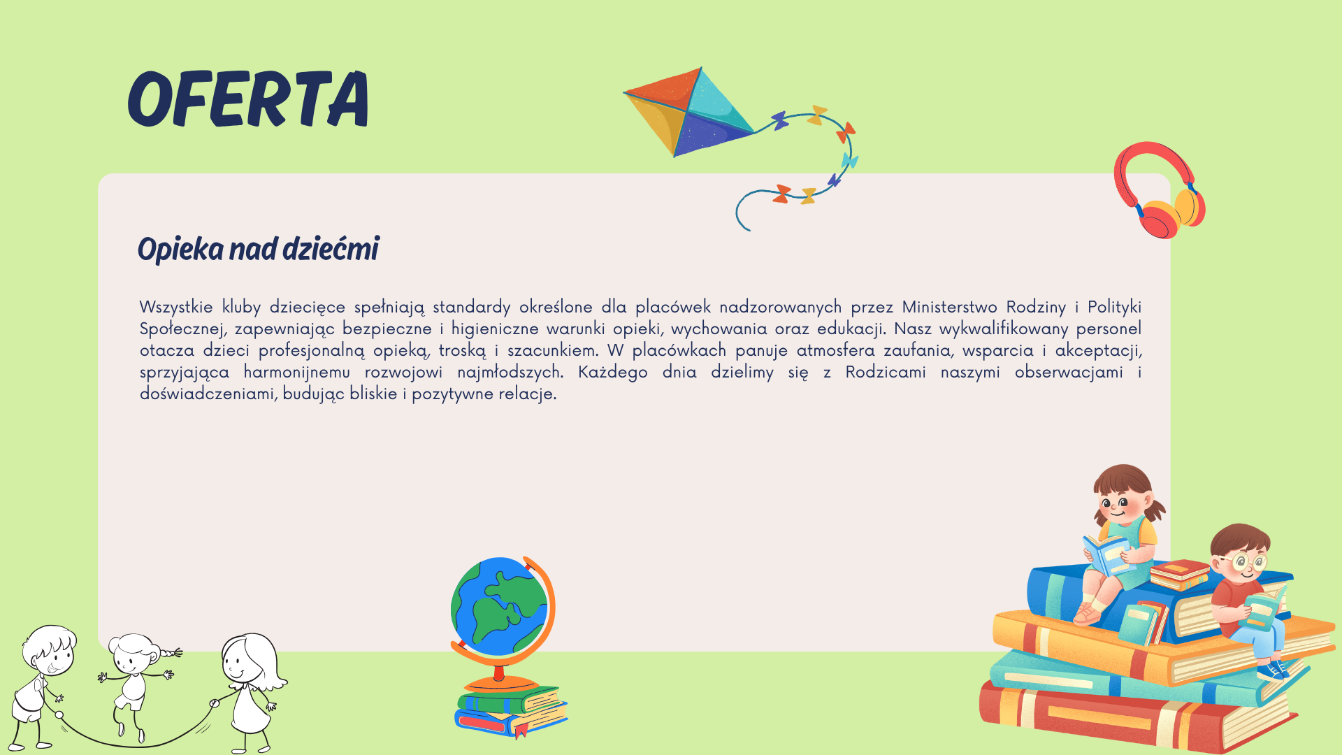 Wszystkie kluby dziecięce spełniają standardy określone dla placówek nadzorowanych przez Ministerstwo Rodziny i Polityki Społecznej, zapewniając bezpieczne i higieniczne warunki opieki, wychowania oraz edukacji. Nasz wykwalifikowany personel otacza dzieci profesjonalną opieką, troską i szacunkiem. W placówkach panuje atmosfera zaufania, wsparcia i akceptacji, sprzyjająca harmonijnemu rozwojowi najmłodszych. Każdego dnia dzielimy się z Rodzicami naszymi obserwacjami i doświadczeniami, budując bliskie i pozytywne relacje.