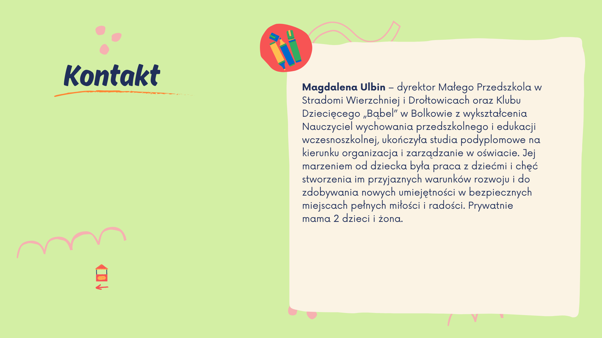 Magdalena Ulbin – dyrektor Małego Przedszkola w Stradomi Wierzchniej i Drołtowicach oraz Klubu Dziecięcego „Bąbel” w Bolkowie z wykształcenia Nauczyciel wychowania przedszkolnego i edukacji wczesnoszkolnej, ukończyła studia podyplomowe na kierunku organizacja i zarządzanie w oświacie. Jej marzeniem od dziecka była praca z dziećmi i chęć stworzenia im przyjaznych warunków rozwoju i do zdobywania nowych umiejętności w bezpiecznych miejscach pełnych miłości i radości. Prywatnie mama 2 dzieci i żona.