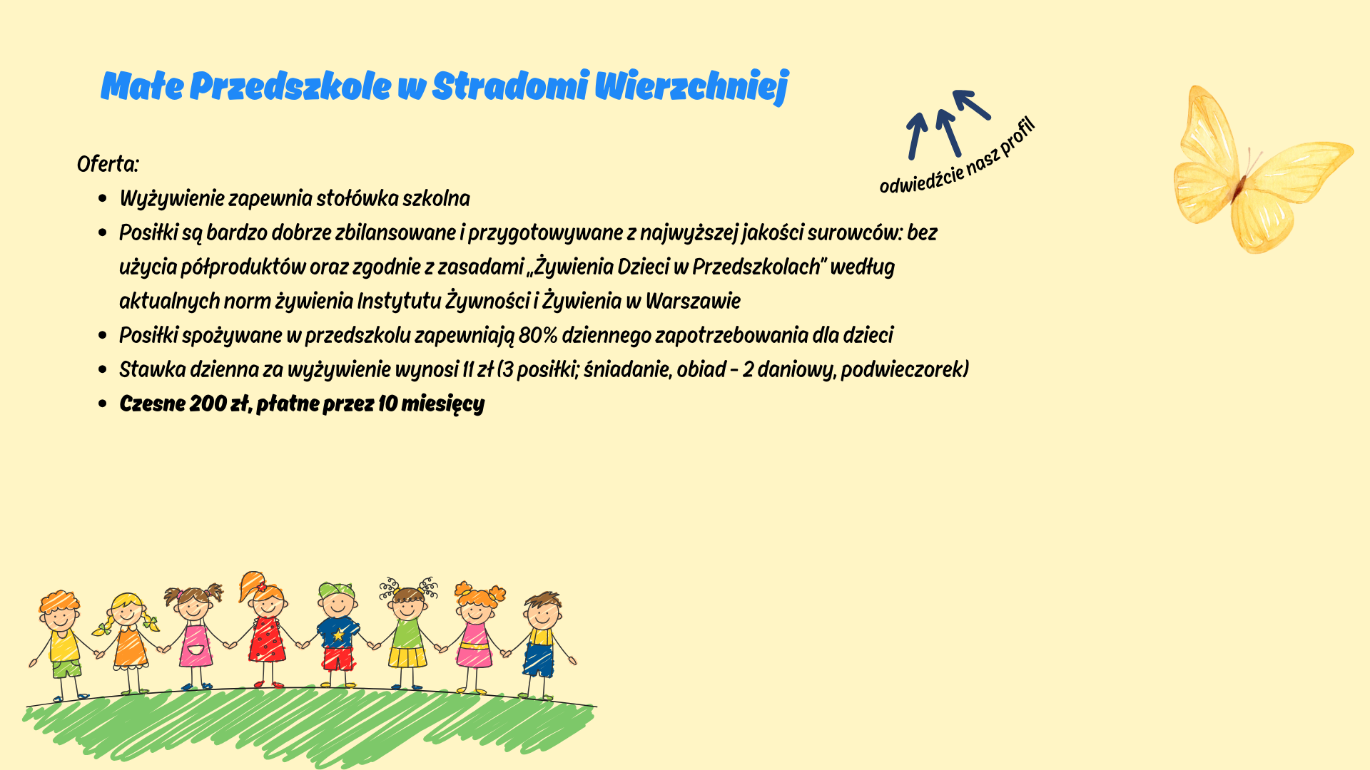 - Stawka dzienna za wyżywienie wynosi 11 zł (3 posiłki; śniadanie, obiad – 2 daniowy, podwieczorek)